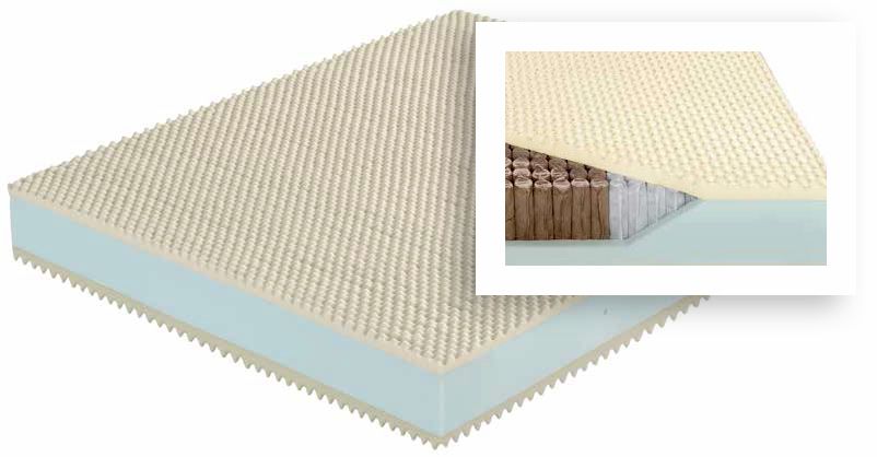 Il materasso è composto da una lastra superiore bugnata in Memory Gel viscoelastico di ultima generazione contenente microparticelle di gel che favoriscono la termoregolazione corporea e la circolazione sanguigna riducendo i punti di pressione.