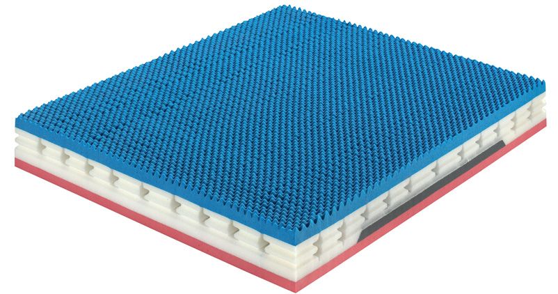 La lastra superiore ed inferiore, in Ergo Foam, sono bugnate per favorire la traspirazione e garantire un ottimale distribuzione del peso corporeo sul materasso, rendendolo adatto ad ogni esigenza di peso e statura.